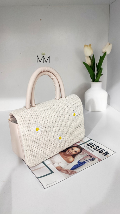 طرح پارچه جلو: بافت حصیری ظریف با گلهای سفید و مرکز زرد 🌼